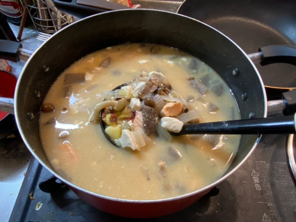 今日のご飯は、シャケとさつまいもの味噌汁です!