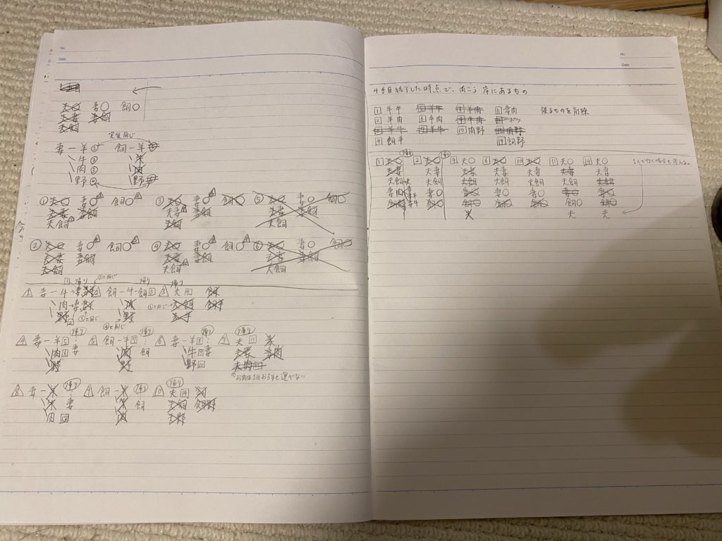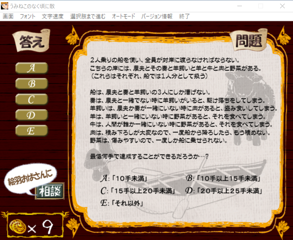 スポンサードリンク 羊と狼のパズル【うみねこのなく頃に散episode8】 うみねこのなく頃に X Facebook はてブ Pocket LINE コピー 2022.03.162022.09.05 2時間考えて、自分の中で11手で達成という結論になり、Bにしたのですが、不正解でした。悔しいです。 (初心者にこんな問題出すな・・・せめて羊と人と狼のシンプルなやつにしてくれ・・・\(^o^)/)