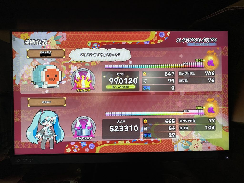 スポンサードリンク フルコンボ エイリアンエイリアン【計画表15日目】 太鼓の達人 X Facebook はてブ Pocket LINE コピー 2022.09.292022.09.30 【重要】フルコンボしたい曲リスト【予定】【太鼓の達人PS4 セッションでドドンがドン】太鼓の達人のまだフルコンボできていない曲を、 できそうな曲から1日1個フルコンボしていこうと思います。(5年前のゲームですが…) ↓予定表を作りました\(^o^)/ 日付フルコンボしたい曲9月12日ゴーストルール9月13日ロストワンの号哭9... ↑この計画表の、15日目を達成しました! 下の段で叩いている初音ミクがちょっと煩わしかったですが、可愛いのでおkですw(何気にミクの可少ないな) 「エイリアンエイリアン」は以前から好きな曲だったので、楽しみながら叩いているうちに、気づいたらフルコンボしていました。譜面は一見難しそうに見えますが、テンポが遅くパターンも決まっているので、簡単でした。また、一番だけではなく、フルで収録されているので、叩きごたえがあって楽しかったです。 pic.twitter.com/7GUygkuMzX— kaede3 (@izayoineet) September 30, 2022