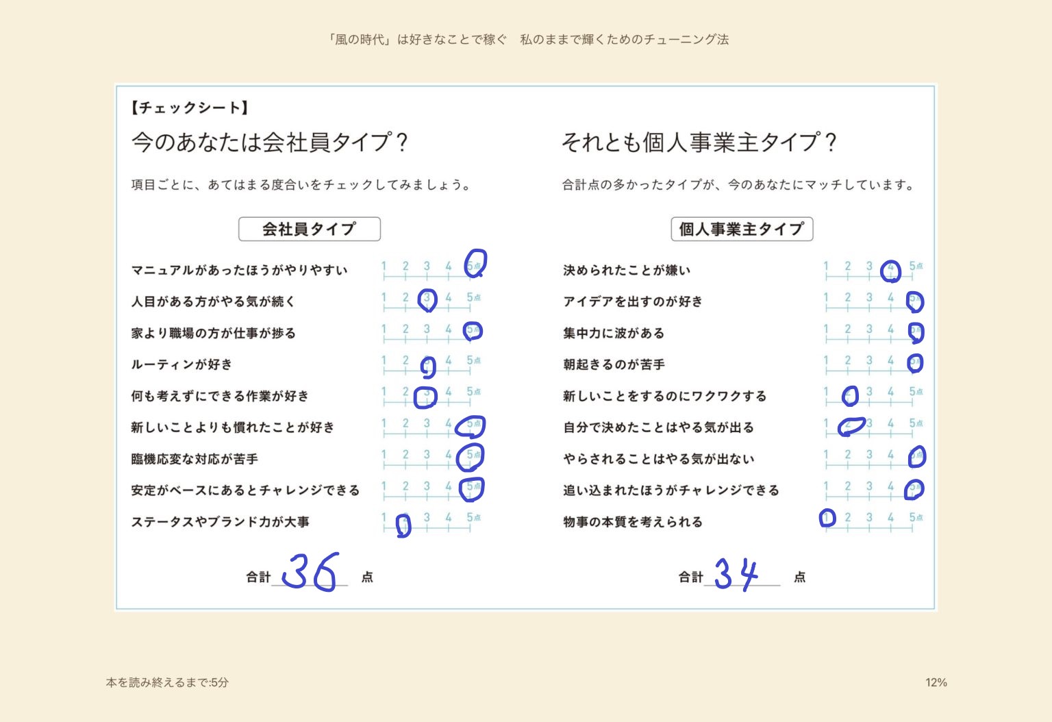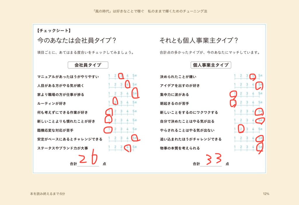 本の内容に興味があった訳では無いのですが、途中でこのようなチェックシートが出てきて面白そうだったので、私も診断してみました。